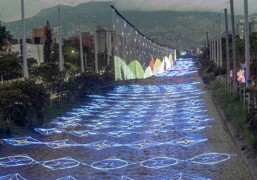 El río Medellín se ilumina con un espectáculo deslumbrante durante el famoso Alumbrado Navideño. Foto: Adobe Stock