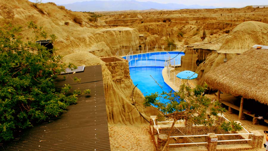 Las temperaturas en el Huila son elevadas, y este punto no es la excepción. Al contrario, es una zona de un calor seco que supera los 35°C. Es aquí donde surgen las piscinas de agua natural, perfectas para refrescarse del clima que puede llegar a ser agotador. Pero lo realmente formidable de todo esto, es divisar uno de los paisajes de Colombia más deslumbrantes desde la tranquilidad y comodidad de una piscina incrustada en medio de un desierto.